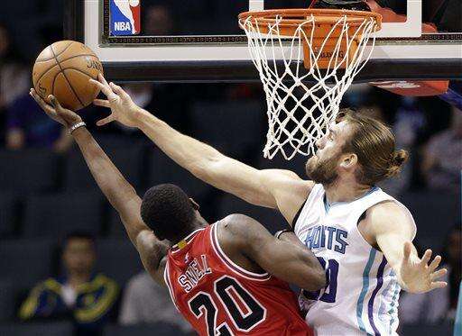 Charlotte Hornets' Spencer Hawes, right, blocks a shot by Chicago Bulls' Tony Snell in the first half of an NBA preseason basketball game in Charlotte, N.C., Monday, Oct. 19, 2015. (AP Photo/Chuck Burton)
