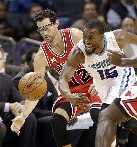 Charlotte Hornets' Kemba Walker (15) battles Chicago Bulls' Kirk Hinrich (12) for the ball in the first half of an NBA preseason basketball game in Charlotte, N.C., Monday, Oct. 19, 2015. (AP Photo/Chuck Burton)