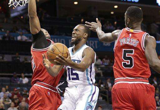 Charlotte Hornets' Kemba Walker, center, drives between Chicago Bulls' Bobby Portis, right, and Taj Gibson, left, in the first half of an NBA preseason basketball game in Charlotte, N.C., Monday, Oct. 19, 2015. (AP Photo/Chuck Burton)