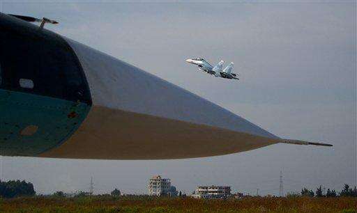 Russia put its military muscle on display, bringing Moscow-based reporters to view a day's worth of fighter jets roaring off a runway in dozens of sorties as helicopter gunships patrolled the edges of the sprawling facility.