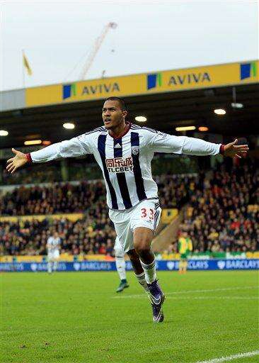 West Bromwich Albion's Salomon Rondon celebrates scoring a goal, during the English League soccer match between Norwich City and West Bromwich Albion, at Carrow Road, in Norwich, England, Saturday Oct. 24, 2015. Stephen Pond/PA Photo via AP) UNITED KINGDOM OUT