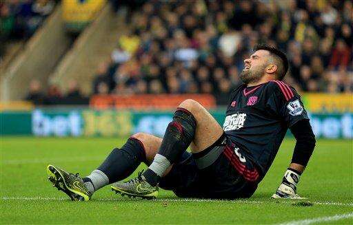 West Bromwich Albion goalkeeper Boaz Myhill reacts, during the English League soccer match between Norwich City and West Bromwich Albion, at Carrow Road, in Norwich, England, Saturday Oct. 24, 2015. Stephen Pond/PA Photo via AP) UNITED KINGDOM OUT
