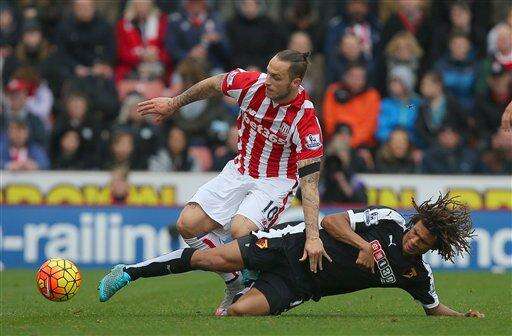 Stoke City's Marko Arnautovic, top, is fouled by Watford's Nathan Ake, during the English Premier League soccer match between Stoke City and and Watford, at the Britannia Stadium, in Stoke, England, Saturday, Oct. 24, 2015. (Dave Thompson/PA Photo via AP) UNITED KINGDOM OUT