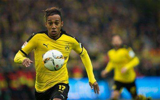 Dortmund's Pierre-Emerick Aubameyang plays the ball during the German Bundesliga soccer match between Borussia Dortmund and FC Augsburg at the Signal Iduna Park in Dortmund, Germany, Sunday Oct. 25, 2015. (Bernd Thissen/dpa via AP) The Associated Press