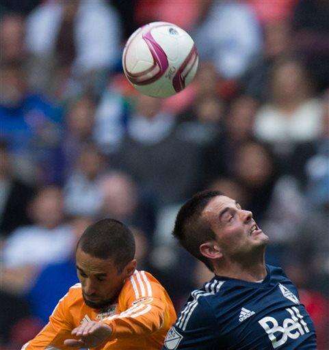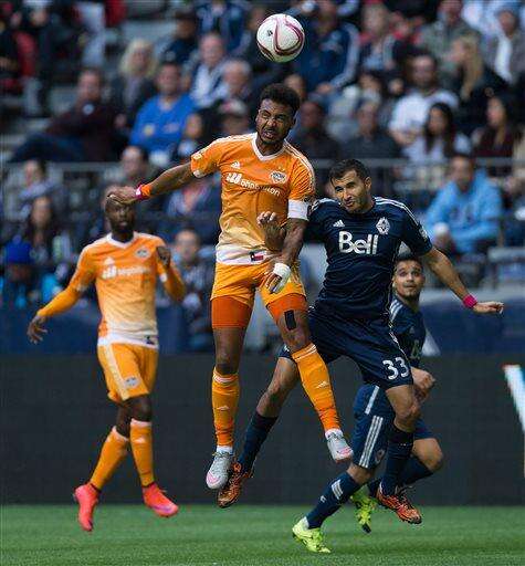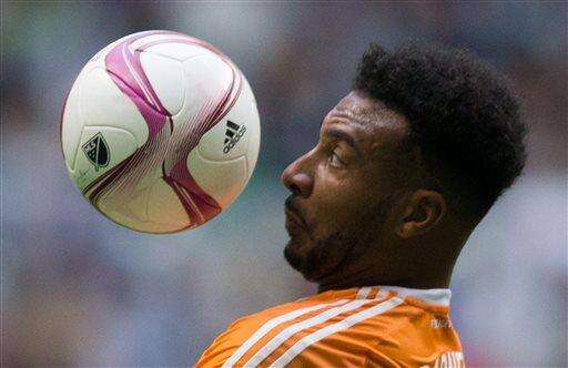 Houston Dynamo's Giles Barnes, of England, knocks down the ball during the first half of an MLS soccer game against the vie for the ball in Vancouver, British Columbia on Sunday, Oct. 25, 2015. Oct. 25, 2015. (Darryl Dyck/The Canadian Press via AP)