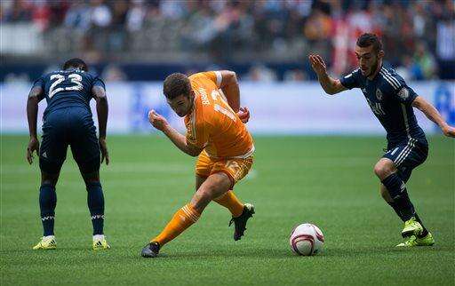 Houston Dynamo's Will Bruin, center, moves the ball between Vancouver Whitecaps' Kekuta Manneh, left, of Gambia, and Russell Teibert during the first half of an MLS soccer game in Vancouver, British Columbia on Sunday, Oct. 25, 2015. Oct. 25, 2015. (Darryl Dyck/The Canadian Press via AP)