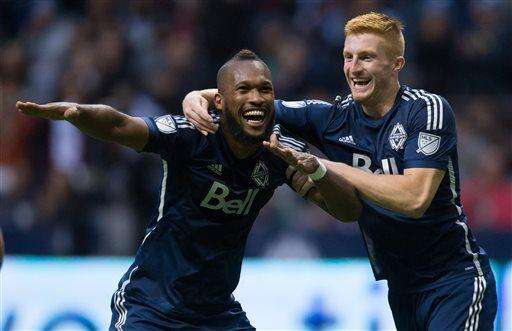Vancouver Whitecaps' Kendall Waston, left, of Costa Rica, and Tim Parker celebrate Waston's goal against the Houston Dynamo during the second half of an MLS soccer game in Vancouver, British Columbia on Sunday, Oct. 25, 2015. Oct. 25, 2015. (Darryl Dyck/The Canadian Press via AP)