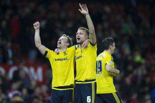 Middlesbrough's Grant Leadbitter, left, celebrates with teammate Ben Gibson after beating Manchester United during the English League Cup soccer match berween Manchester United and Middlesbrough at Old Trafford Stadium, Manchester, England, Wednesday Oct. 28, 2015. (AP Photo/Jon Super) The Associated Press