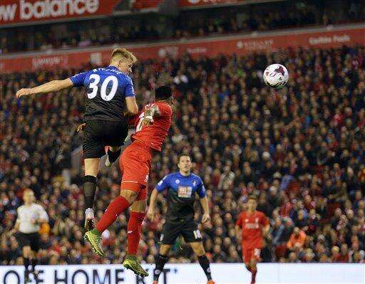 Bournemouth's Matt Ritchie left, attempts a header at the goal during their English League Cup Fourth Round soccer match against Liverpool at Anfield in Liverpool, England, Wednesday Oct. 28, 2015. (AP Photo/Clint Hughes) The Associated Press