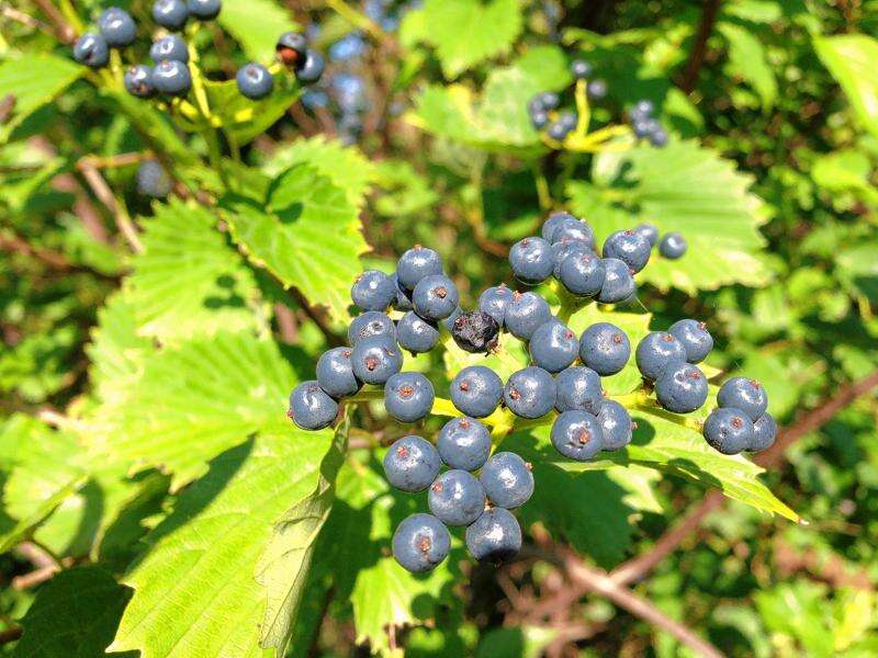 The branches of Arrowwood Viburnum (V. dentatum) are first covered with white flowers in early summer and then laden with blue berries in late summer. The birds in my yard eat most of the fruit in fall, but some remain for winter treats. Arrowwood Viburnums grow in full sun to part shade and are adaptable to a wide range of soil conditions.