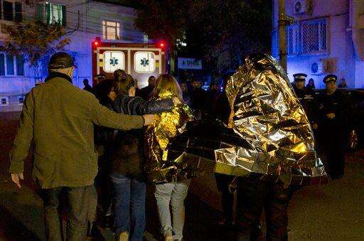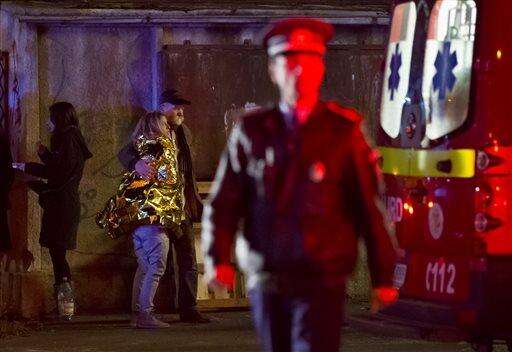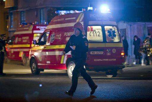 Ambulances are parked outside the site of an explosion that occurred in a club, housed by the building in the background, in Bucharest, early Saturday, Oct. 31, 2015. An explosion and ensuing flames on a stage at a Bucharest nightclub on Friday left more than 20 people dead and over 150 hospitalized with injuries, Romania's interior minister said. (AP Photo/Vadim Ghirda)