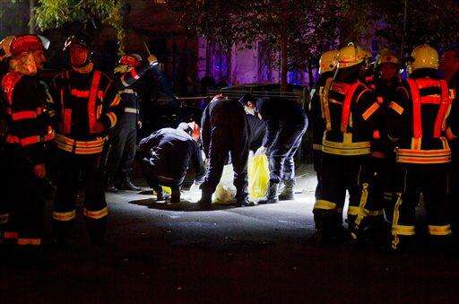 Emergency workers walk outside the scene of an explosion that occurred in a club in Bucharest, early Saturday, Oct. 31, 2015. An explosion and ensuing flames on a stage at a Bucharest nightclub on Friday left more than 20 people dead and over 100 hospitalized with injuries, Romania's interior minister said. (AP Photo/Vadim Ghirda)