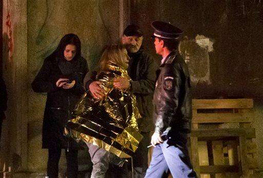 A survivor of an explosion that occurred in a club in Bucharest, Romania, cries, wrapped in a thermal blanket outside the blast scene early Saturday, Oct. 31, 2015. An explosion and ensuing flames on a stage at a Bucharest nightclub on Friday left more than 20 people dead and over 150 hospitalized with injuries, Romania's interior minister said. (AP Photo/Vadim Ghirda)