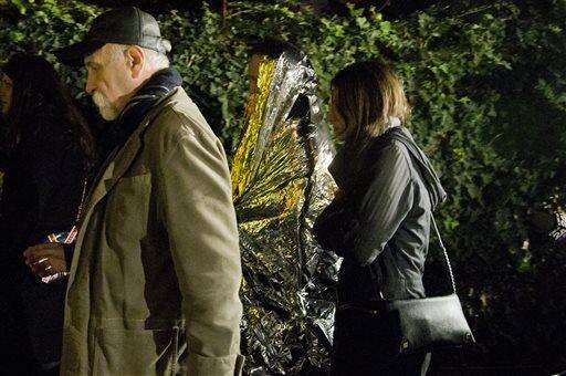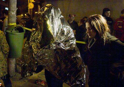 A survivor of an explosion that occurred in a club in Bucharest, Romania, stands wrapped in a thermal blanket outside the blast scene early Saturday, Oct. 31, 2015. An explosion and ensuing flames on a stage at a Bucharest nightclub on Friday left more than 20 people dead and over 150 hospitalized with injuries, Romania's interior minister said. (AP Photo/Vadim Ghirda)