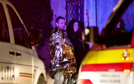 Survivors of an explosion that occurred in a club in Bucharest, are led away from the blast scene wrapped in a thermal blanket early Saturday, Oct. 31, 2015. An explosion and ensuing flames on a stage at a Bucharest nightclub on Friday left more than 20 people dead and over 150 hospitalized with injuries, Romania's interior minister said. (AP Photo/Vadim Ghirda)