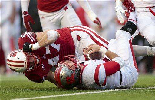 Wisconsin tight end Mitchell Herl (47) sacks Rutgers quarterback Chris Laviano (5) during the first half of an NCAA college football game Saturday, Oct. 31, 2015, in Madison, Wis. (AP Photo/Andy Manis)
