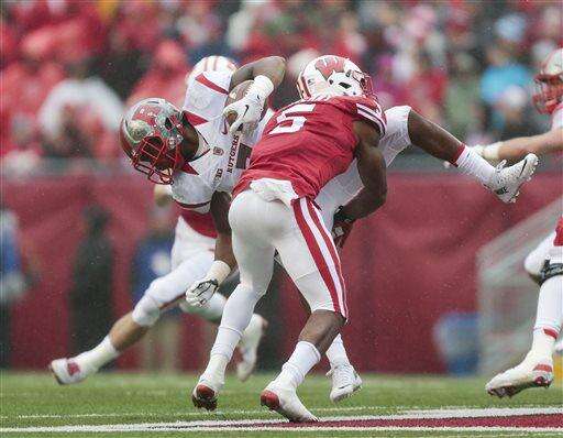 Wisconsin cornerback Darius Hillary (5) up ends Rutgers running back Robert Martin (7) during the first half of an NCAA college football game Saturday, Oct. 31, 2015, in Madison, Wis. (AP Photo/Andy Manis)