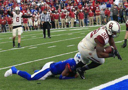 Oklahoma scored on its first drive of the second half when Sam Grant snagged a 1-yard touchdown pass from Mayfield. Kansas fumbled on the first play of the next drive, and Oklahoma quickly took a 52-7 lead after backup quarterback Trevor Knight finished a short drive with a 1-yard touchdown run.