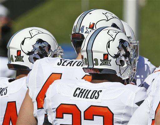 Oklahoma State players wear stickers on their helmets of a kneeling Pistol Pete, in memory of the victims of last week's homecoming parade crash in Stillwater, Okla., before the start of an NCAA college football game against Texas Tech in Lubbock, Texas, Saturday, Oct. 31, 2015. (AP Photo/Sue Ogrocki)