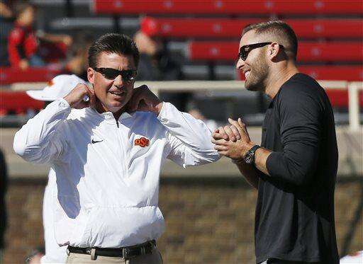 Oklahoma State head coach Mike Gundy, left, talks with Texas Tech head coach Kliff Kingsbury, right, before the start of an NCAA college football game in Lubbock, Texas, Saturday, Oct. 31, 2015. (AP Photo/Sue Ogrocki)