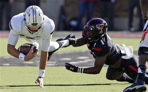 Oklahoma State quarterback Mason Rudolph, left, is tackled by Texas Tech defensive back Nigel Bethel, right, in the second quarter of an NCAA college football game in Lubbock, Texas, Saturday, Oct. 31, 2015. (AP Photo/Sue Ogrocki)