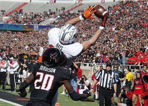 Oklahoma State wide receiver Austin Hays, top, catches a pass for a touchdown in front of Texas Tech defender Tevin Madison (20) in the first quarter of an NCAA college football game in Lubbock, Texas, Saturday, Oct. 31, 2015. (AP Photo/Sue Ogrocki)