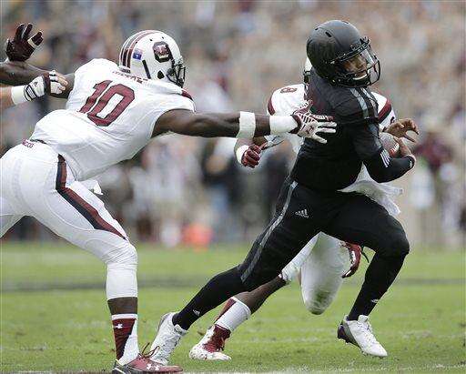 Texas A&M quarterback Kyler Murray, right, looks to escape the grasp of South Carolina linebacker Skai Moore (10 ) during the first half of an NCAA college football game, Saturday, Oct. 31, 2015, in College Station, Texas. (AP Photo/Eric Gay) The Associated Press