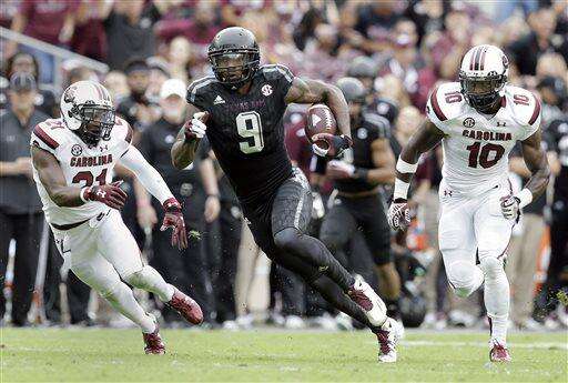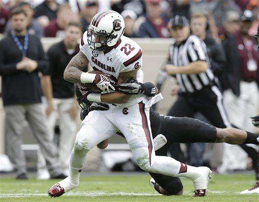 South Carolina running back Brandon Wilds (22) is hit as he runs against Texas A&M during the first half of an NCAA college football game, Saturday, Oct. 31, 2015, in College Station, Texas. (AP Photo/Eric Gay) The Associated Press