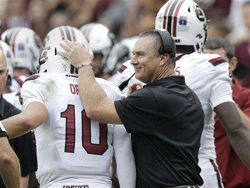 South Carolina head coach Shawn Elliott, right, congratulates quarterback Perry Orth (10) after he scored a touchdown against Texas A&M during the first half of an NCAA college football game, Saturday, Oct. 31, 2015, in College Station, Texas. (AP Photo/Eric Gay) The Associated Press