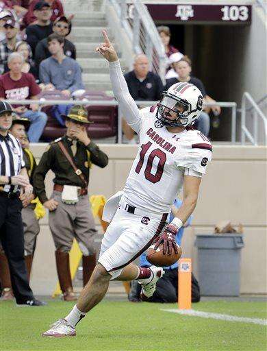 South Carolina quarterback Perry Orth (10) celebrates as he scores a touchdown against Texas A&M during the first half of an NCAA college football game, Saturday, Oct. 31, 2015, in College Station, Texas. (AP Photo/Eric Gay) The Associated Press