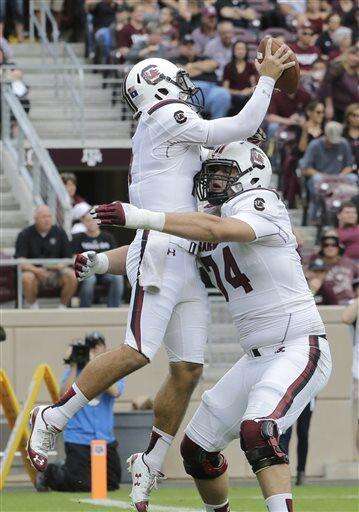 South Carolina quarterback Perry Orth, left, jumps into the arms of teammate Mason Zandi (74) as he celebrates after scoring a touchdown against Texas A&M during the first half of an NCAA college football game, Saturday, Oct. 31, 2015, in College Station, Texas. (AP Photo/Eric Gay) The Associated Press
