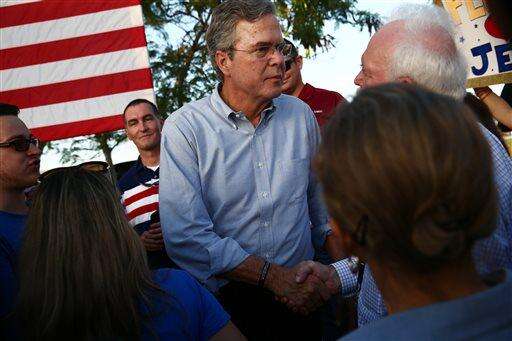 Republican presidential candidate, former Florida Gov. Jeb Bush greets supporters after speaking at an outdoor rally before attending a high school football in Punta Gorda, Fla., Friday, Oct. 30, 2015. (Dorothy Edwards/Naples Daily News via AP) FORT MYERS OUT; MANDATORY CREDIT The Associated Press