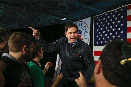 Republican presidential candidate, Sen. Marco Rubio, R-Fla., talks to supporters after speaking at the Iowa GOP's Growth and Opportunity Party at the Iowa state fair grounds in Des Moines, Iowa, Saturday, Oct. 31, 2015. (AP Photo/Nati Harnik) The Associated Press