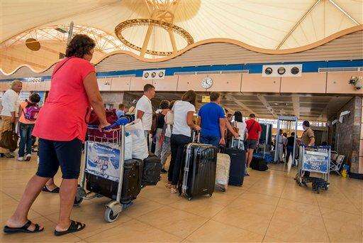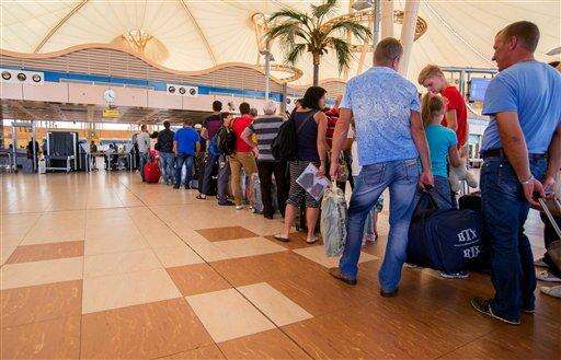 Passengers line up to depart from Sharm el-Sheikh Airport hours after a Russian aircraft carrying 224 people, including 17 children, crashed about 20 minutes after taking off from Sharm el-Sheikh, a Red Sea resort popular with Russian tourists, in south Sinai, Egypt, Saturday, Oct. 31, 2015. A Russian Metrojet plane crashed Saturday morning in a mountainous region in the Sinai after taking off from Sharm el-Sheikh, killing all 224 people aboard. A senior aviation official said the pilot had radioed that the aircraft was experiencing technical problems shortly before air traffic controllers lost contact with the plane. (AP Photo)