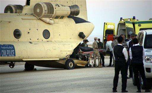 Egyptian emergency workers unload bodies of victims from the crash of a Russian aircraft over the Sinai peninsula from a police helicopter to ambulances at Kabrit military airport, some 20 miles north of Suez, Egypt, Saturday, Oct. 31, 2015. A Russian Metrojet plane crashed Saturday morning in a mountainous region in the Sinai after taking off from Sharm el-Sheikh, killing all 224 people aboard. Officials said the pilot had reported a technical problem and was looking to make an emergency landing before radio contact with air traffic controllers went dead. (AP Photo/Amr Nabil)