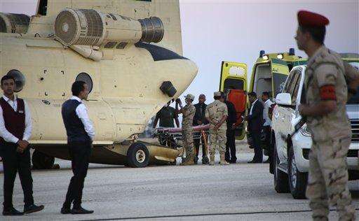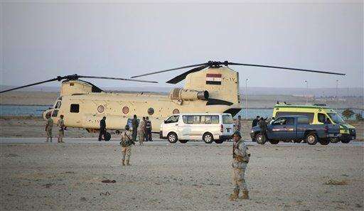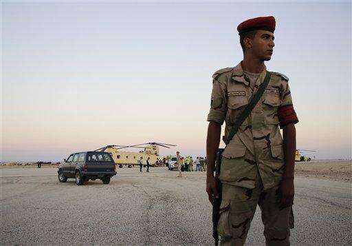 Egyptian soldiers stand guard as rescuers carry bodies of victims of a plane crash from a civil police helicopter to ambulances at Kabrit airport in Suez, 100 kilometers east of Cairo, Egypt, Saturday, Oct. 31, 2015. A Russian aircraft carrying 224 people, including 17 children, crashed Saturday in a remote mountainous region in the Sinai Peninsula about 20 minutes after taking off from a Red Sea resort popular with Russian tourists, the Egyptian government said. (AP Photo/Amr Nabil)