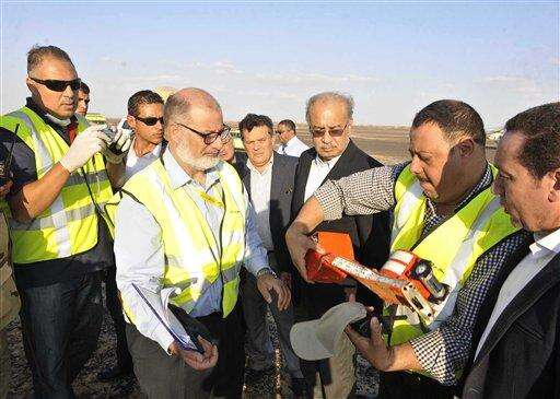 In this image released by the Prime Minister's office, Sherif Ismail, third right, examines the flight data recorder inspected by officials at the site where a passenger plane crashed in Hassana Egypt, Friday, Oct. 31, 2015. The Russian aircraft carrying 224 people, including 17 children, crashed Saturday in a remote mountainous region in the Sinai Peninsula about 20 minutes after taking off from a Red Sea resort popular with Russian tourists, the Egyptian government said. There were no survivors.(Suliman el-Oteify, Egypt Prime Minister's Office via AP)