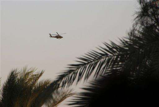 An Egyptian military Apache helicopter watches the site over Kabrit military airport, some 20 miles north of Suez, Egypt, Saturday, Oct. 31, 2015. A Russian Metrojet plane crashed Saturday morning in a mountainous region in the Sinai after taking off from Sharm el-Sheikh, killing all 224 people aboard. Officials said the pilot had reported a technical problem and was looking to make an emergency landing before radio contact with air traffic controllers went dead. (AP Photo/Amr Nabil)