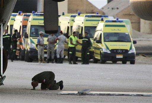 An Egyptian soldier prays as emergency workers prepare to unload bodies of victims from the crash of a Russian aircraft over the Sinai peninsula from a police helicopter to ambulances at Kabrit military airport, some 20 miles north of Suez, Egypt, Saturday, Oct. 31, 2015. A Russian Metrojet plane crashed Saturday morning in a mountainous region in the Sinai after taking off from Sharm el-Sheikh, killing all 224 people aboard. Officials said the pilot had reported a technical problem and was looking to make an emergency landing before radio contact with air traffic controllers went dead. (AP Photo/Amr Nabil)