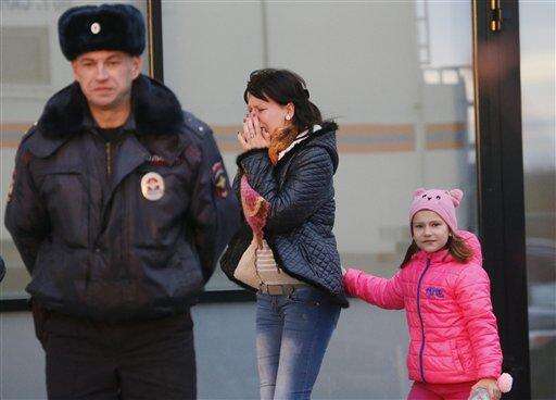 Relatives react after a Russian airliner with 217 passengers and seven crew aboard crashed, as people gather at Russian airline Kogalymaviaâs information desk at Pulkovo airport in St.Petersburg, Russia, Saturday, Oct. 31, 2015. Russia's civil air agency is expected to have a news conference shortly to talk about the Russian Metrojet passenger plane that Egyptian authorities say has crashed in Egypt's Sinai peninsula.(AP Photo/Dmitry Lovetsky)