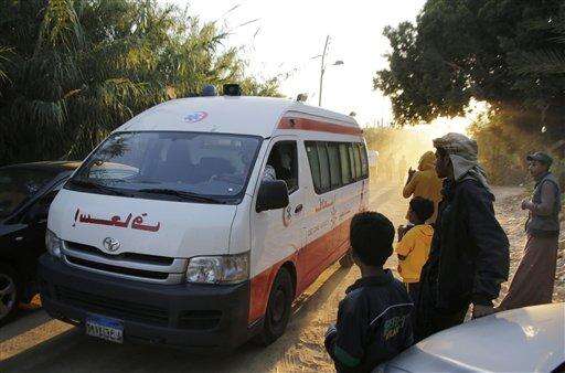 Villagers of Kabrit watch an ambulance as it prepares to unload bodies of victims from the crash of a Russian aircraft over the Sinai peninsula, near Kabrit military airport, some 20 miles north of Suez, Egypt, Saturday, Oct. 31, 2015. A Russian Metrojet plane crashed Saturday morning in a mountainous region in the Sinai after taking off from Sharm el-Sheikh, killing all 224 people aboard. Officials said the pilot had reported a technical problem and was looking to make an emergency landing before radio contact with air traffic controllers went dead. (AP Photo/Amr Nabil)