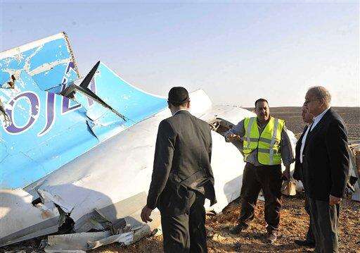 In this image released by the Prime Minister's office, Sherif Ismail, right, looks at the remains of a crashed passenger jet in Hassana Egypt, Friday, Oct. 31, 2015. A Russian aircraft carrying 224 people, including 17 children, crashed Saturday in a remote mountainous region in the Sinai Peninsula about 20 minutes after taking off from a Red Sea resort popular with Russian tourists, the Egyptian government said. There were no survivors.(Suliman el-Oteify, Egypt Prime Minister's Office via AP)