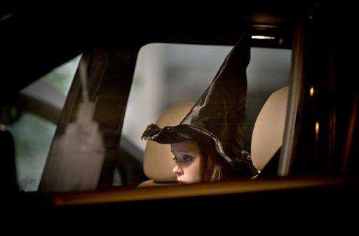 A child wears a Halloween hat sits in a vehicle, as the adults accompanying her light candles and lay flowers outside the compound that housed the nightclub where a fire occurred in the early morning hours in Bucharest, Romania, Saturday, Oct. 31, 2015. Hundreds of young people had gone clubbing at the hip Colectiv nightclub Friday night to enjoy a free concert by the Goodbye to Gravity metal band but the evening ended in horror, as the inferno caused a panic that killed tens of people and injured many others.(AP Photo/Vadim Ghirda)