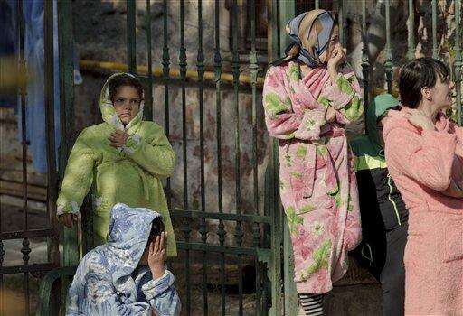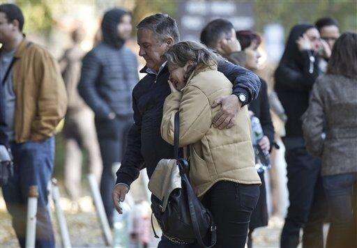 Residents stand outside outside the compound that housed the nightclub where a fire occurred in the early morning hours in Bucharest, Romania, Saturday, Oct. 31, 2015. Hundreds of young people had gone clubbing at the hip Colectiv nightclub Friday night to enjoy a free concert by the Goodbye to Gravity metal band but the evening ended in horror, as the inferno caused a panic that killed tens of people and injured many others.(AP Photo/Vadim Ghirda)