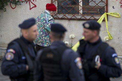 An elderly woman places flowers outside the compound that housed the nightclub where a fire occurred in the early morning hours in Bucharest, Romania, Saturday, Oct. 31, 2015. Hundreds of young people had gone clubbing at the hip Colectiv nightclub Friday night to enjoy a free concert by the Goodbye to Gravity metal band but the evening ended in horror, as the inferno caused a panic that killed tens of people and injured many others.(AP Photo/Vadim Ghirda)