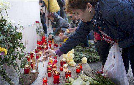 A woman lights candles outside the compound that housed the nightclub where a fire occurred in the early morning hours in Bucharest, Romania, Saturday, Oct. 31, 2015. Hundreds of young people had gone clubbing at the hip Colectiv nightclub Friday night to enjoy a free concert by the Goodbye to Gravity metal band but the evening ended in horror, as the inferno caused a panic that killed tens of people and injured many others.(AP Photo/Vadim Ghirda)