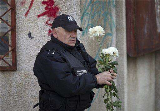 A policeman holds flowers outside the compound that housed the nightclub where a fire occurred in the early morning hours in Bucharest, Romania, Saturday, Oct. 31, 2015. Hundreds of young people had gone clubbing at the hip Colectiv nightclub Friday night to enjoy a free concert by the Goodbye to Gravity metal band but the evening ended in horror, as the inferno caused a panic that killed tens of people and injured many others.(AP Photo/Vadim Ghirda)