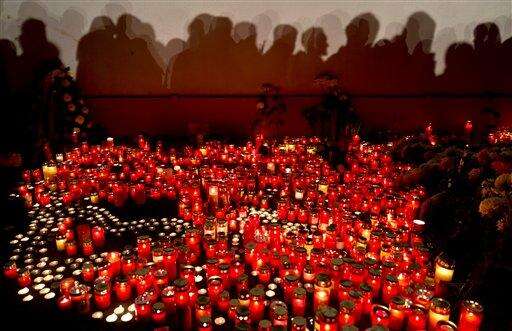 People cast shadows on a wall as they wait to light candles and lay flowers outside the compound that housed the nightclub where a fire occurred in the early morning hours in Bucharest, Romania, Saturday, Oct. 31, 2015. Hundreds of young people had gone clubbing at the hip Colectiv nightclub Friday night to enjoy a free concert by the Goodbye to Gravity metal band but the evening ended in horror, as the inferno caused a panic that killed tens of people and injured many others.(AP Photo/Vadim Ghirda)