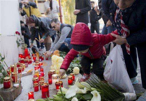 A child lights candles outside the compound that housed the nightclub where a fire occurred in the early morning hours in Bucharest, Romania, Saturday, Oct. 31, 2015. Hundreds of young people had gone clubbing at the hip Colectiv nightclub Friday night to enjoy a free concert by the Goodbye to Gravity metal band but the evening ended in horror, as the inferno caused a panic that killed tens of people and injured many others.(AP Photo/Vadim Ghirda)