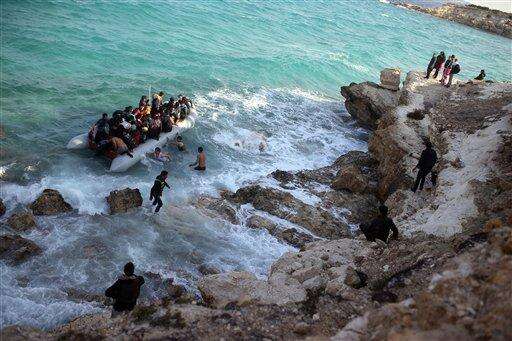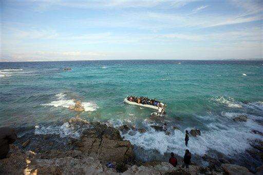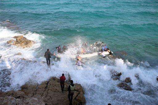 Refugees and migrants board a dingy as waves push them back onto the rocks, as they set out, trying to travel from the Turkish coast to the Greek island of Chios, near Cesme, Turkey, Saturday, Oct. 31, 2015. Authorities in Greece say 21 people have died in other islands after two boats carrying migrants and refugees from Turkey to Greece sank overnight, in the latest deadly incidents in the eastern Aegean Sea. (AP Photo/Emre Tazegul) The Associated Press